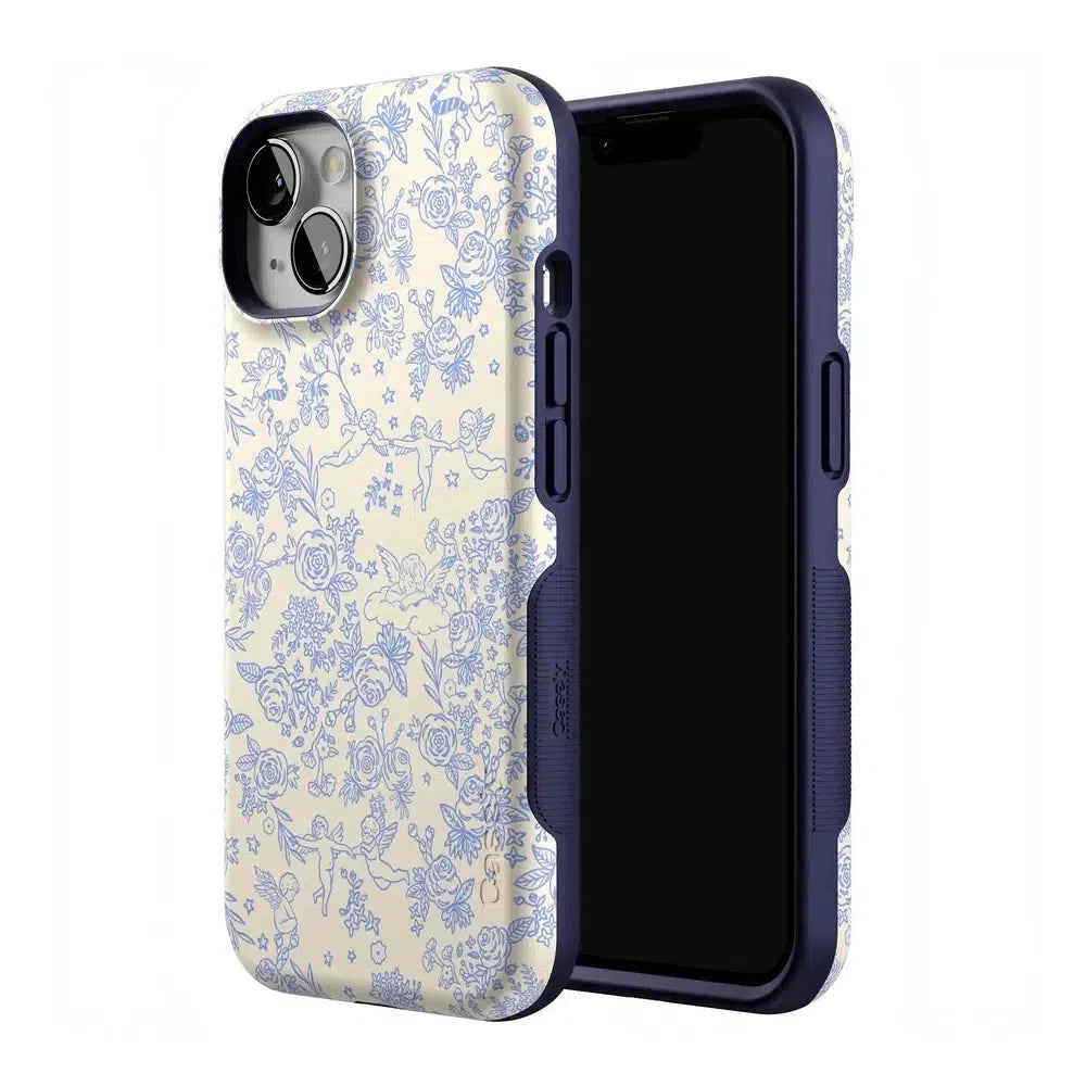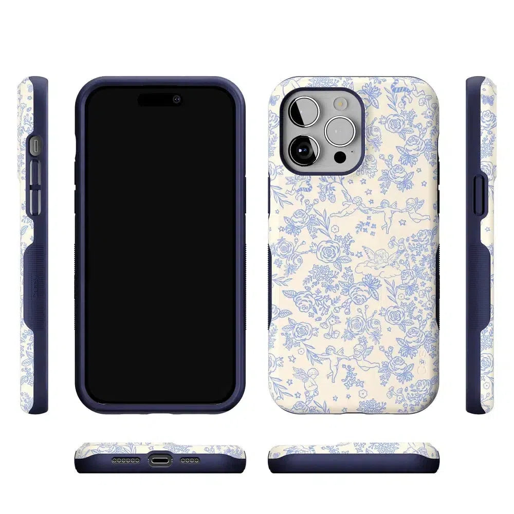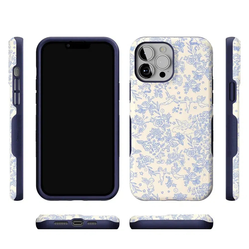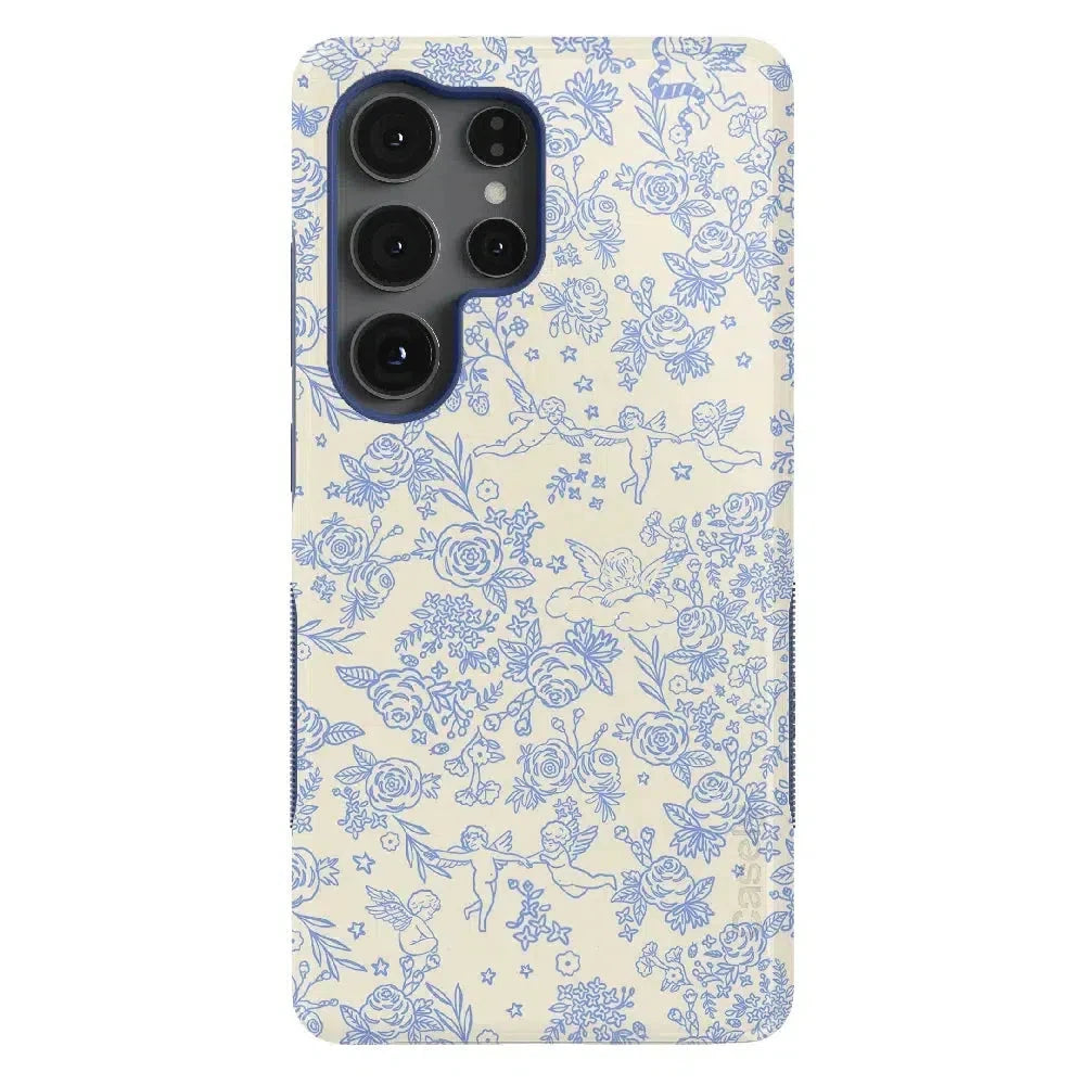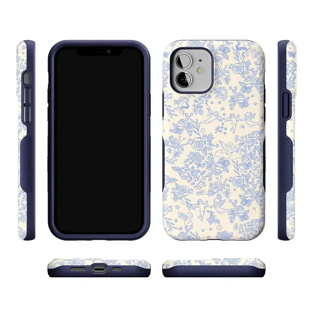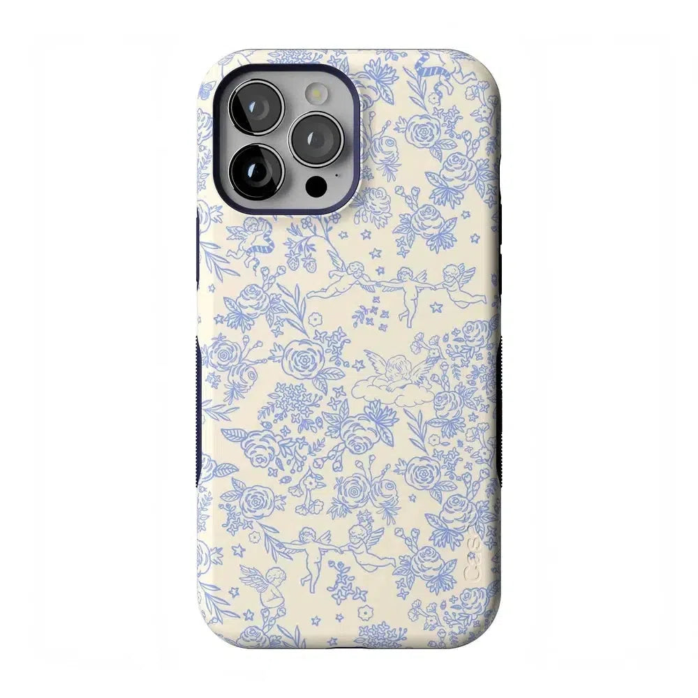 Embrace elegance and whimsy with the Cupid’s Canvas | Periwinkle Floral Case. This delicate design features charming cherubs and intricate floral patterns in soft periwinkle hues. bringing a touch of romance and artistry to your everyday life. Whether you’re a fan of classic beauty or looking for something unique to protect your phone. this case offers both stunning visuals and solid protection.