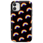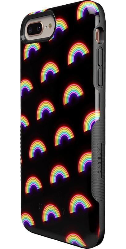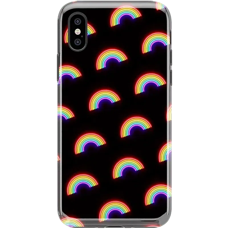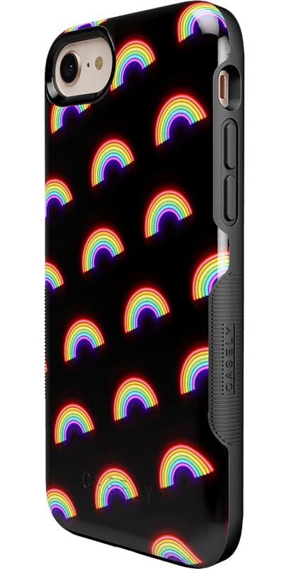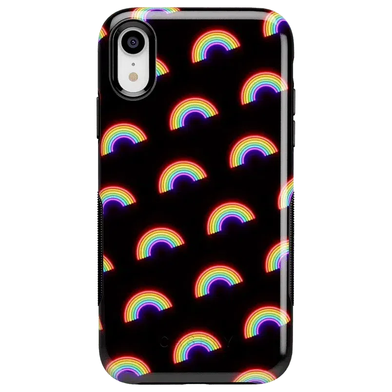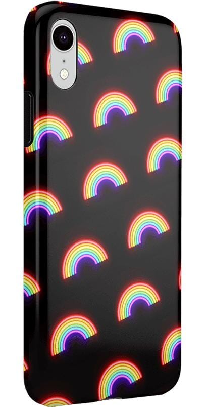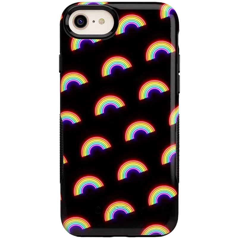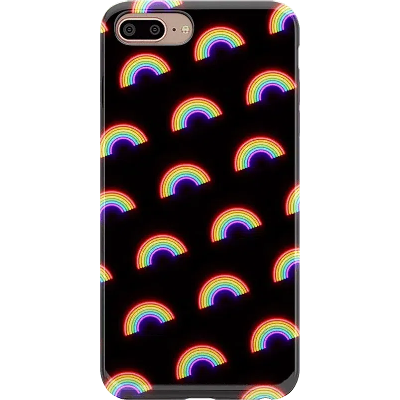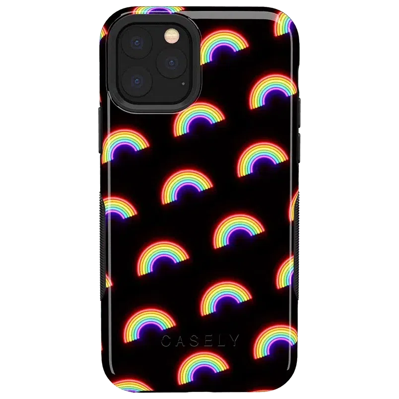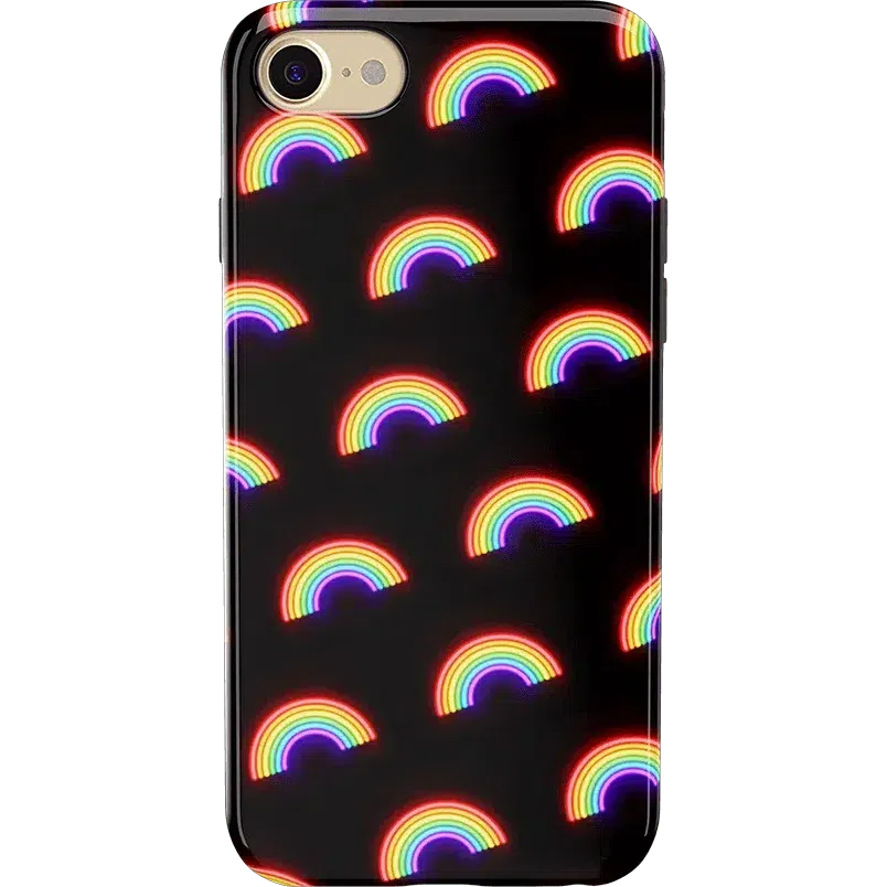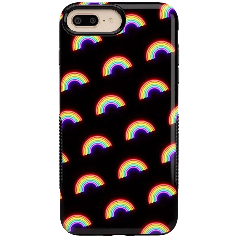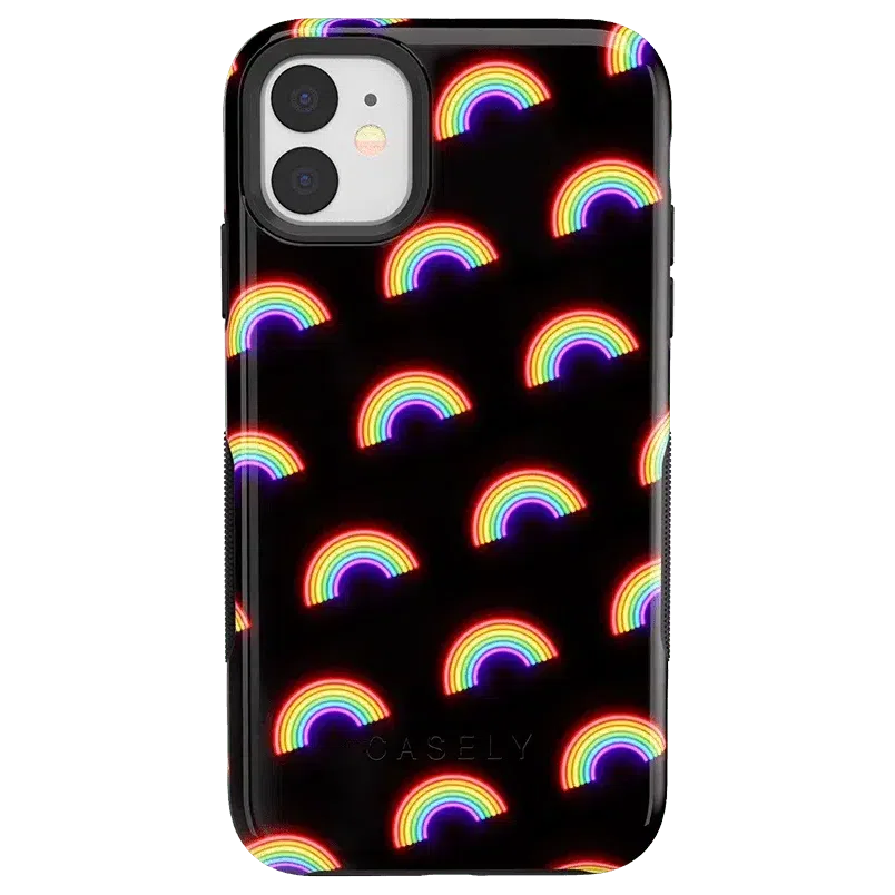 Rainbows are one of the most mesmerizing sights to witness – Why not flaunt one on your phone and bring a plethora of colors with you everywhere you go? With the Endless Rainbows LED Print Case offered in both the Bold and Classic Collections. you can! This case features a group of fun-sized rainbows arranged in a symmetrical diagonal pattern. Each rainbow contains the classic red. orange. yellow. green. blue. and purple color scheme. The rainbows. which radiate with a neon flair. shine brightly against a black background. It offers you a beautiful and striking color contrast that will be sure to impress. Because of its bold design and conservative background. this case will complement the simplest or most extravagant of outfits! While out and about. you can rest assured knowing that its raised edges will protect your phone from a cracked screen or broken buttons. The Endless Rainbows LED case is available for all generations of iPhones. so you no one has to miss out on the positivity it has to offer!