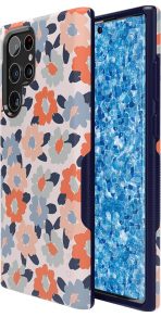 This case covers a satisfying spectrum of color. with flowers ranging from a bold orange to a pale blue. Each flower has its unique shape. reflecting the artistry that went into the design.