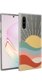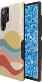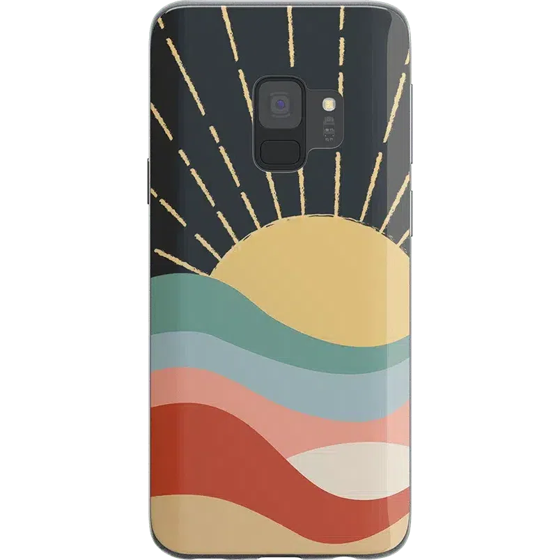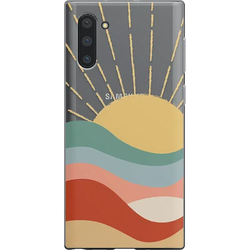 The design features a golden sun at the top with beams shooting upward over a multi-layered landscape. Each layer of the landscape features a different color. from a cool teal to a warm reddish-brown. At first. this amount of color may sound overbearing. but the pale tones all mix together for a satisfying display that we’re certain you’ll love. Give your phone the protection and style it deserves with this colorful phone case.