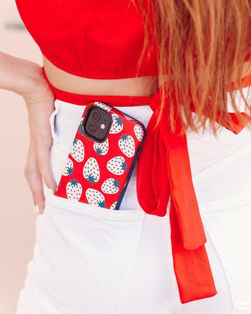 Playful meets protection with this very-strawberry design! The powder-pink strawberries against a popping red background make this case immediately stand out. Compliments and conversations are bound to accompany this case as it says young. bold. and fresh.