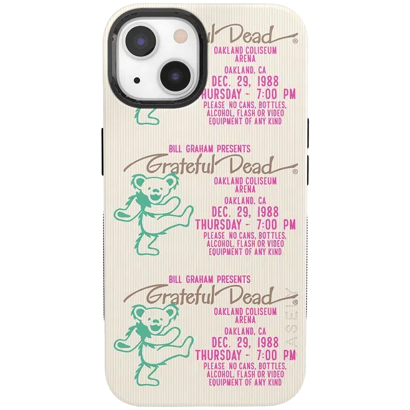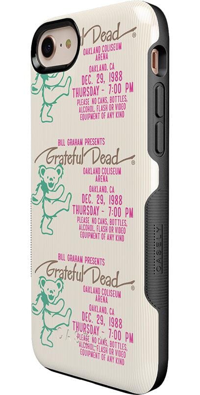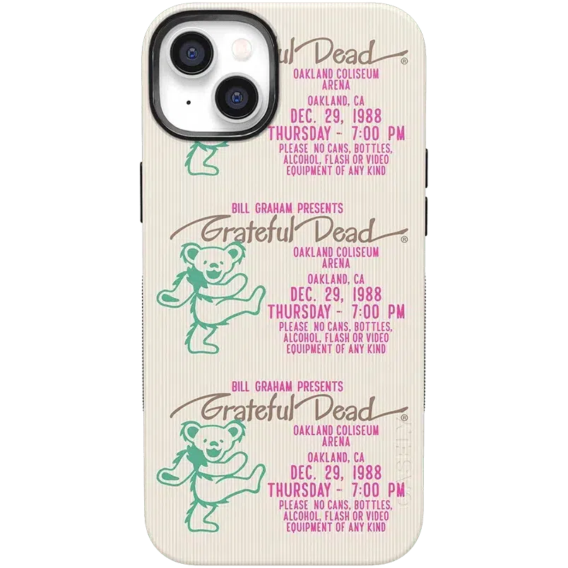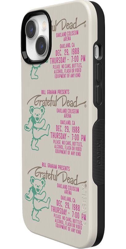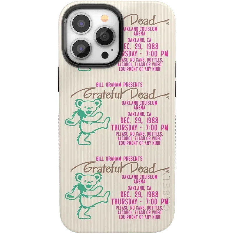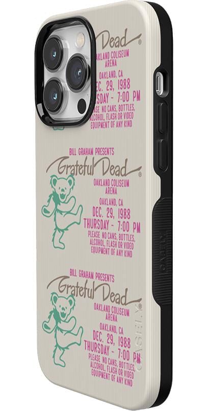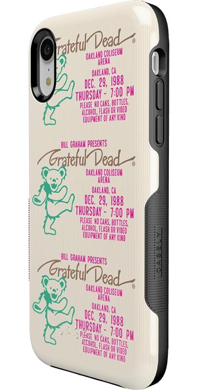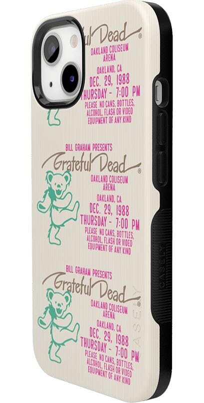 We’re kicking it back to 12/29/88 at Oakland Coliseum Arena with our NEW Miracle Ticket | Grateful Dead Vintage Case. The original ticket from the Grateful Dead’s rockin’ show is featured on this stylish phone case. and allows you to bring a piece of the legendary band with you everywhere you go. This limited-edition product is part of the Grateful Dead x Casely collection and is available for all iPhone 6 and up. It’s stunning and durable. and is perfect for any Deadhead.