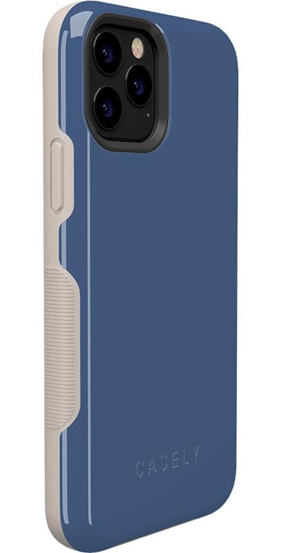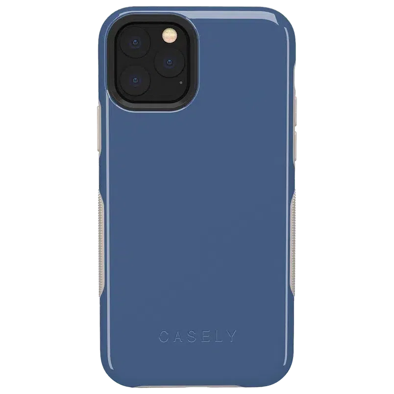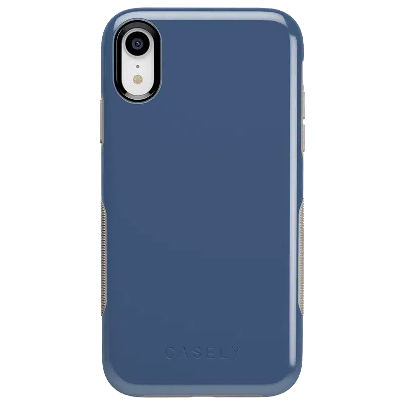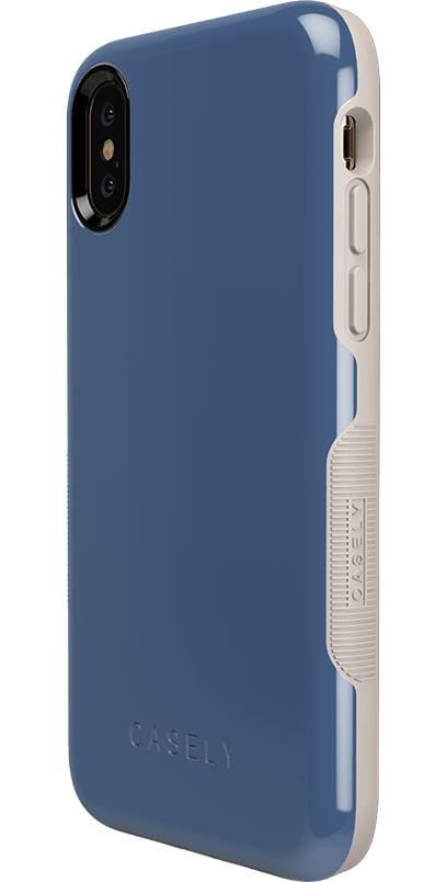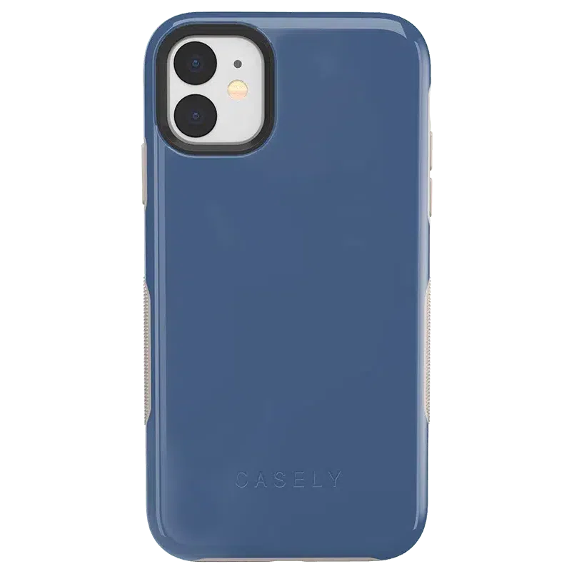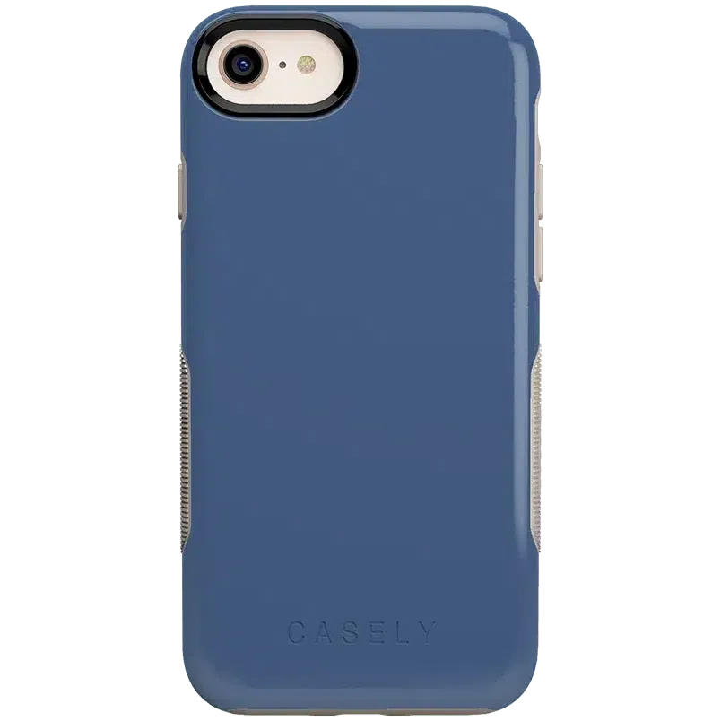 If you enjoy the coolness of blue. but bright colors or dark navy are not your style. this steel blue case is the right choice for you. The Steel Blue on Nude case. featured in the Casely Bold Collection. is a muted. deep blue that resembles a cool steel color. with nude accents along the sides and edges to offset the cool tone. Despite the shade of blue. this is a surprisingly compatible color scheme for any number of outfits and occasions. With special air pockets inside the case to keep your phone safe from falls and drops. as well as a 3mm raised edge around the front and a smaller raised edge around the camera to prevent damage. this case is highly durable. You will have no worries about choosing between a simple. elegant fashion and a case that will truly protect your phone – you can have it all!
